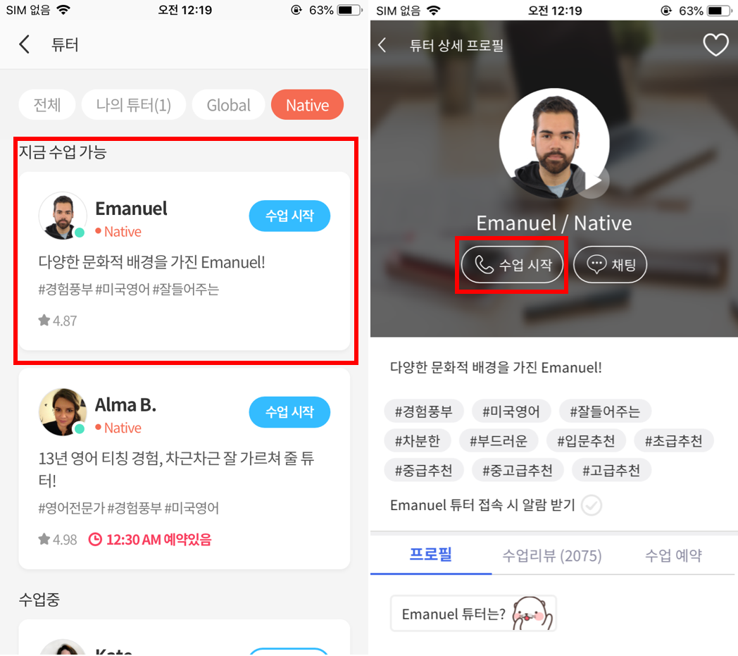 튜터는 필리핀 튜터와 네이티브 튜터가 있다. 앱에 들어가자마자 지금 접속 중인 튜터를 바로 찾아 볼 수 있으며, 그 중에 마음에 드는 튜터와 레벨 테스트를 진행하면 된다. 개인적으로 나는 발음을 제대로 배우고 싶은 욕심이 있기에 네이티브 튜터를 더 선호하 한다. 그래서 레벨 테스트도 네이티브 튜터와 진행했다.