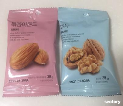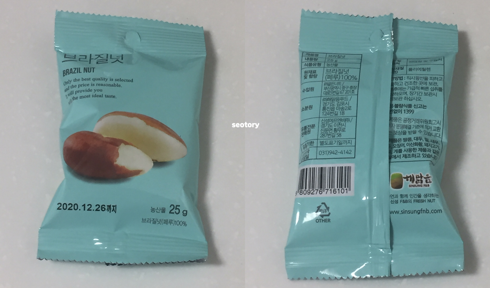 지난 번에 소개한 견과류믹스와는 달리 이번엔 한 가지 견과만 들어 있는 제품을 소개할까 한다. 다른 편의점도 그런지 모르겠지만 GS25에서는 단일 종류의 견과로 구성된 다양한 견과류팩을 팔고 있다. 참고로 브라질넛뿐만 아니라 아몬드, 호두도 있다.