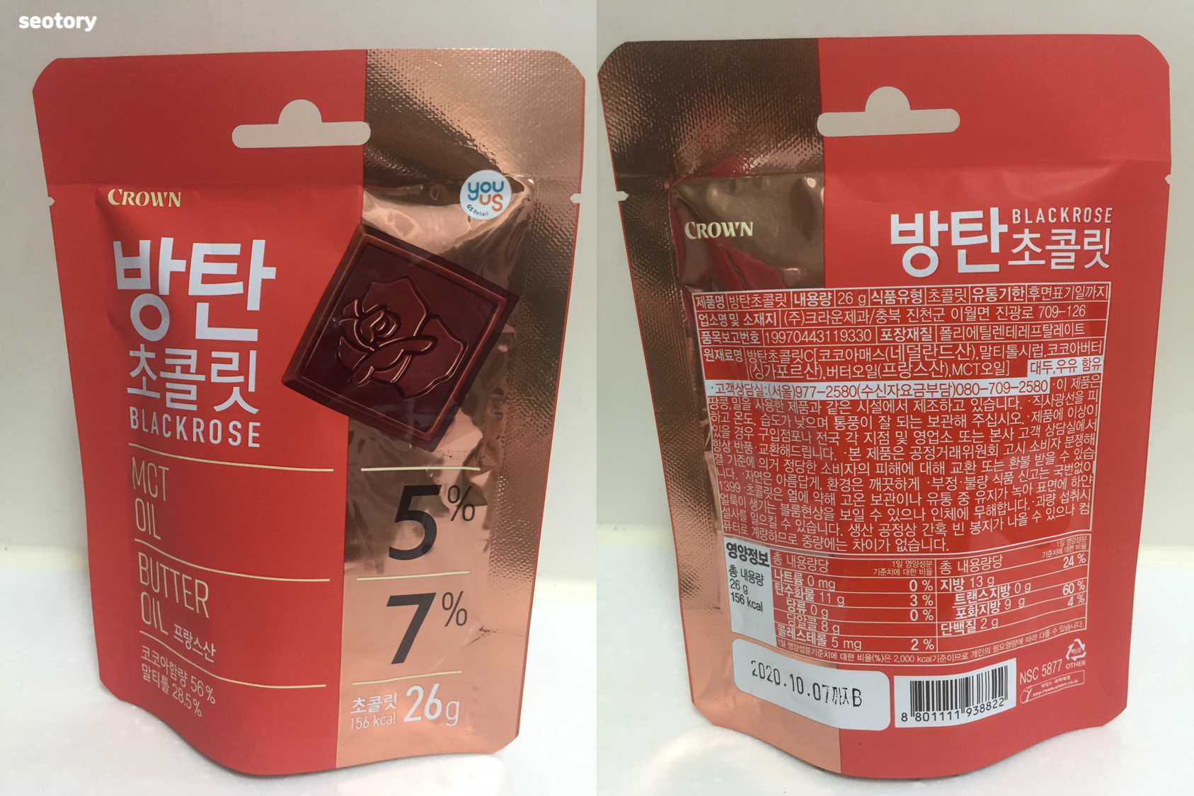| 원재료명 | 방탄초콜릿C[코코아매스(네덜란드산), 말티톨시럽, 코코아버터(싱가포르산), 버터오일(프랑스산), MCT 오일] 대두, 우유 함유 |