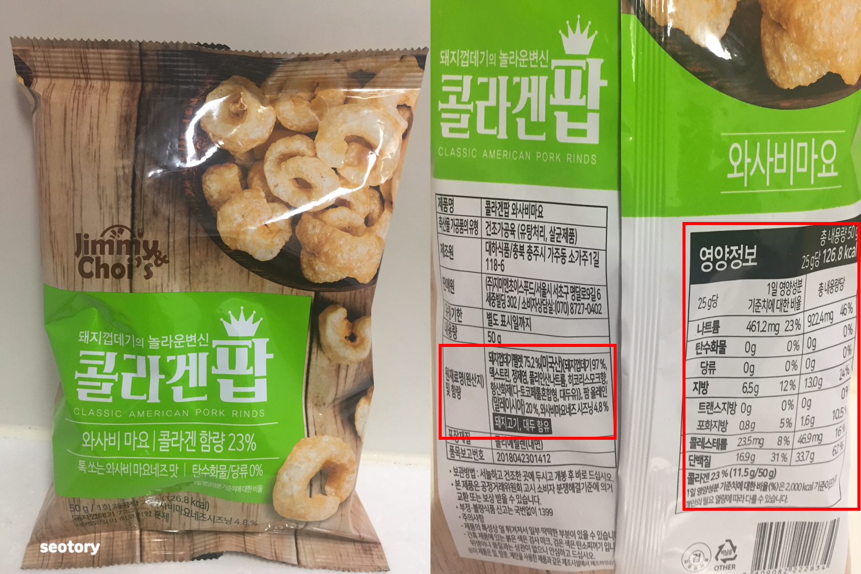 다음으로는 와사비 마요 맛이다. 일단 오리지날에 비해 돼지껍데기 함량이 72.2%로 적고, 대신 와사비마요네즈 시즈닝이 4.8% 첨가 됐다. 이걸 보며 시즈닝이 되어있으니 그나마 오리지널에 비해 괜찮지 않을까 하는 희망을 품었다 ㅎㅎ