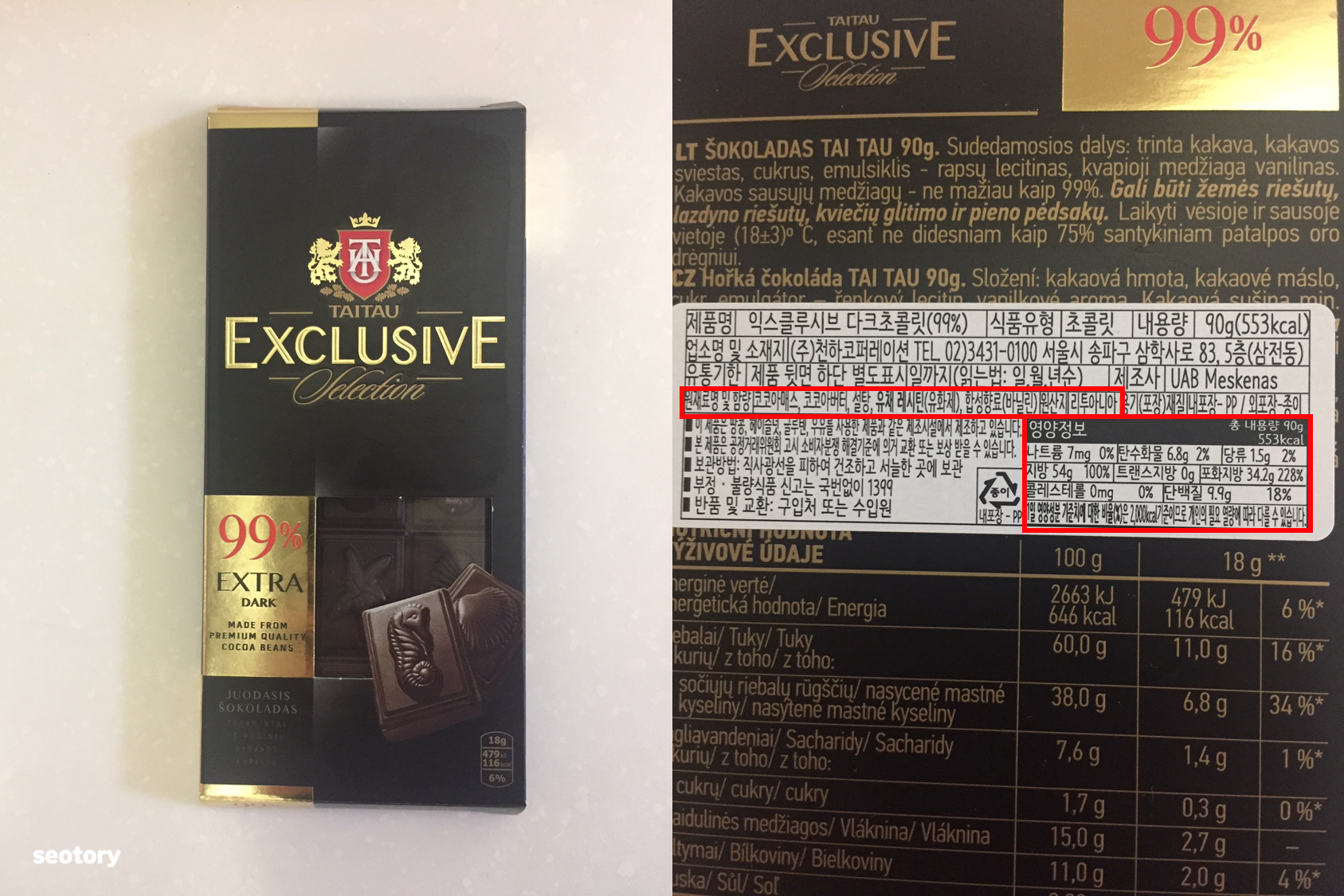 마지막으로 먹어본 건 타이타우 익스클루시브 다크 초콜릿이었다. 이것도 원재료명 및 함량이 잘 안 보일 거 같아서 한 번 적어 봤다. 역시나 함량은 표기되어 있지 않다.