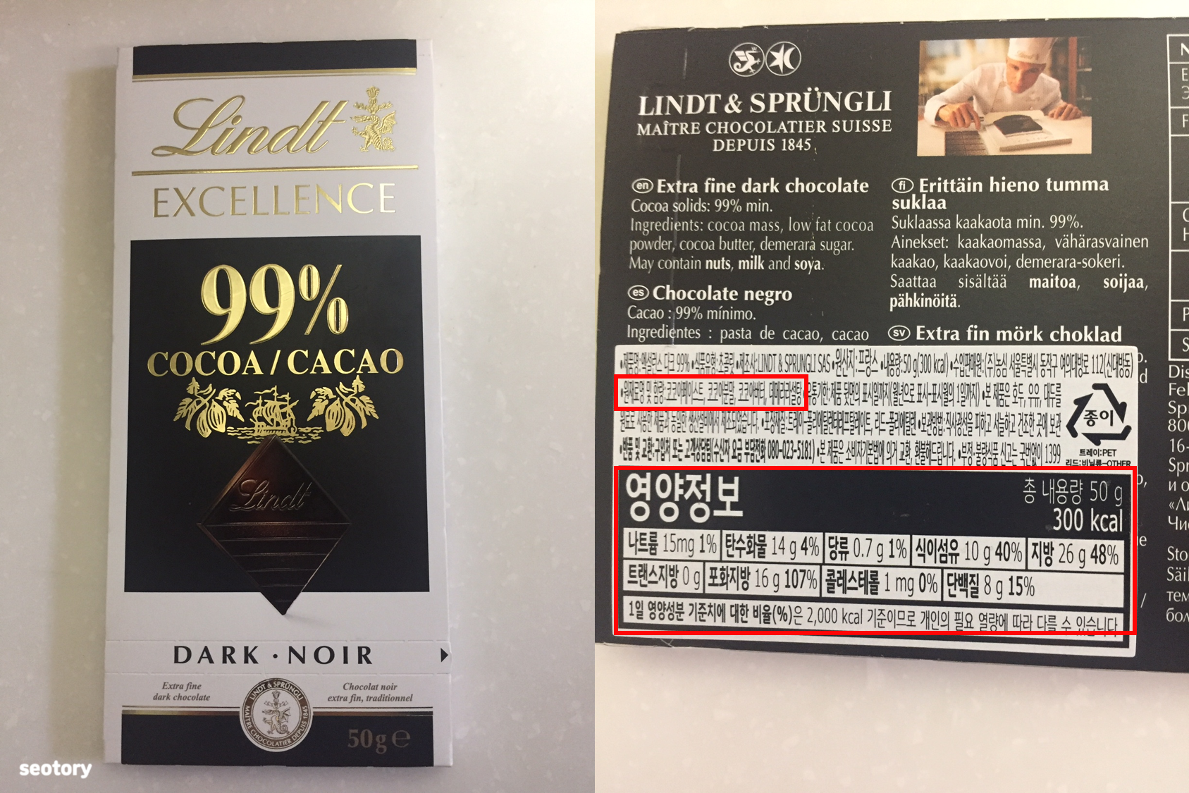 다크 초콜릿 언급할 때 제일 많이 들어 본 린트 초콜릿. 원재료명이 잘 안 보여서 글로 써보자면 아래 내용과 같다. 참고로 원재료명 및 함량이라고 되어 있는데 함량은 표기가 안 되어 있다. 영양정보를 보면 탄수화물과 당류가 살짝 아쉽다.