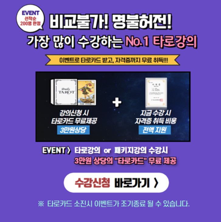 게다가 현재(20.03.15 기준) 타로강의 or 패키지강의 수강 시 타로카드 무료 제공 및 자격증 취득 비용 전액 지원하는 이벤트를 하고 있다.